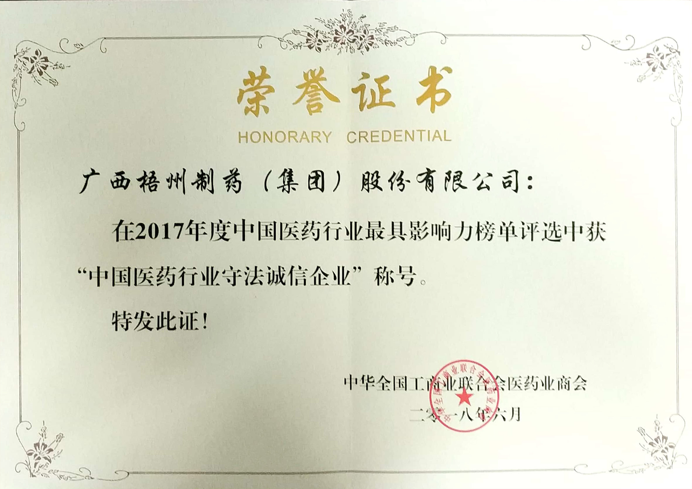 榮獲2017年度中國醫(yī)藥行業(yè)守法誠信企業(yè)稱號