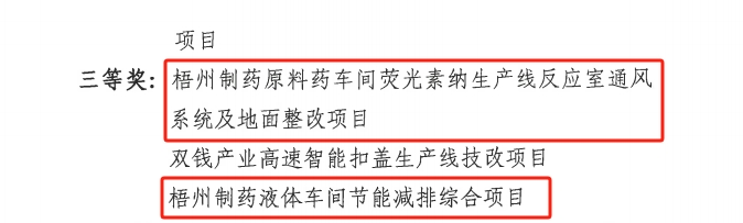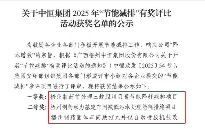近日,在中恒集團(tuán)“節(jié)能減排”2025年有獎(jiǎng)評(píng)比活動(dòng)中,梧州制藥多項(xiàng)目脫穎而出,包攬一、二、三等獎(jiǎng)。其中,前處理車(chē)間三蛇膽川貝膏節(jié)能降耗減排項(xiàng)目獲一等獎(jiǎng);動(dòng)力基建車(chē)間減低污水處理能耗措施項(xiàng)目、固體車(chē)間跌打丸外包自動(dòng)噴膠機(jī)技改項(xiàng)目獲二等獎(jiǎng);原料藥車(chē)間熒光素鈉生產(chǎn)線(xiàn)反應(yīng)室通風(fēng)系統(tǒng)及地面整改項(xiàng)目、液體車(chē)間減排綜合項(xiàng)目獲三等獎(jiǎng)。
