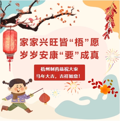 家家興旺皆“梧”愿歲歲安康“要”成真梧州制藥恭祝大家馬年大吉,吉祥如意!午馬迎新 馬年大吉家家興旺皆“梧”愿,歲歲安康“要”成真。躍馬揚(yáng)鞭開(kāi)新局,一馬當(dāng)先爭(zhēng)一流。梧州制藥恭祝大家馬年大吉,吉祥如意!END圖文丨潘
